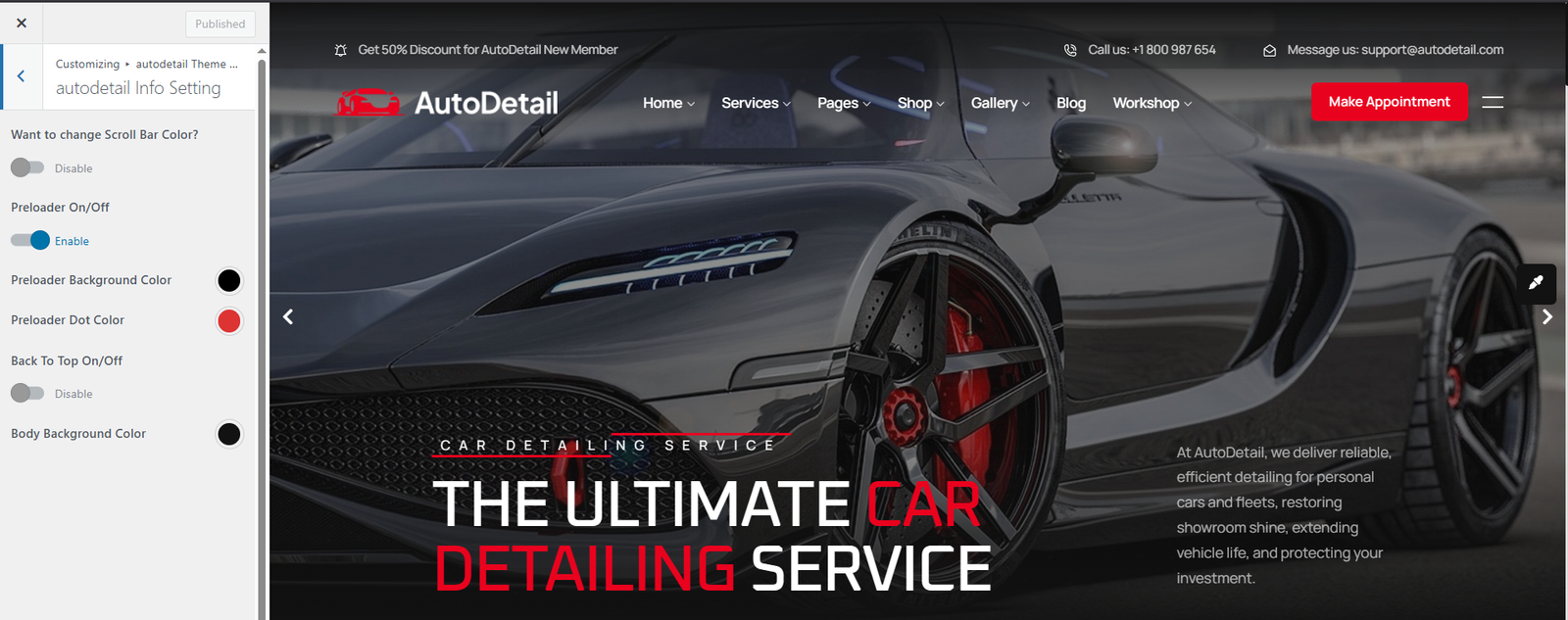 Requirements Theme Installation Required Plugin [1] Plugins Documentation and Video Tutorials Importing Demo Content How To Set Default Home Page Theme Customization Options [4] Auto Detail Default Settings 404 Page Blog Options Elementor Global Site Settings Edit Header Information [1] Header Menu Options Edit Footer Information Elementor Widget Troubleshooting [2] Demo content installation Failed 404 Error in all pages Update The Theme [3] Envato Market Plugin Manual Update Update by FTP Locate your Envato Item Purchase Code Contact Translations Home / Documentation / Autodetails – Car Rental WordPress Theme / Theme Customization Options Auto Detail Default Settings At General section you can do below things Preloader On/Off Preloader Background Color Preloader Dot Color Back To Top On/Off Change Scrollbar Color Doc navigation 404 Page > Was this page helpful? Yes No Leave a Reply Cancel replyYour email address will not be published. Required fields are marked *Comment * Name* Email* Website Save my name, email, and website in this browser for the next time I comment.