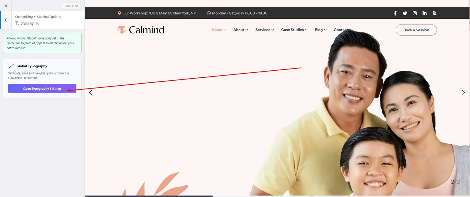 Appearance -> Customizer -> Calmind Options -> Typography Settings