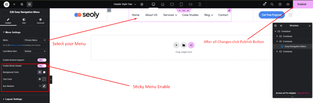 3. Then you can easily add the site logo, menu, and as like you want using elementor. You can add anything using drag & drop system. Our all theme same way you can change header or footer content.