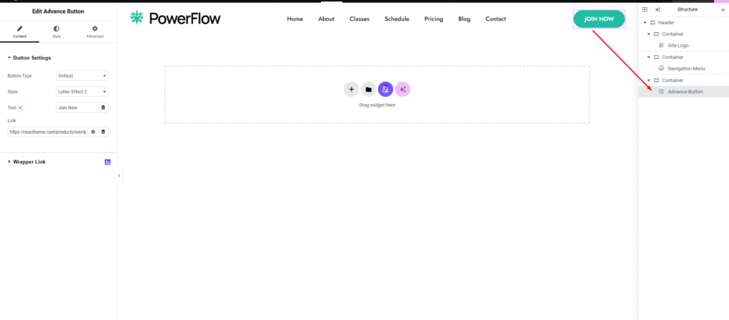 As you already know, once you’re in the Elementor editor, you can add anything you want to your site. For our design, we needed a stylish button in the header. We used our Advanced Button Widget to create this type of button with a modern, stylish effect.