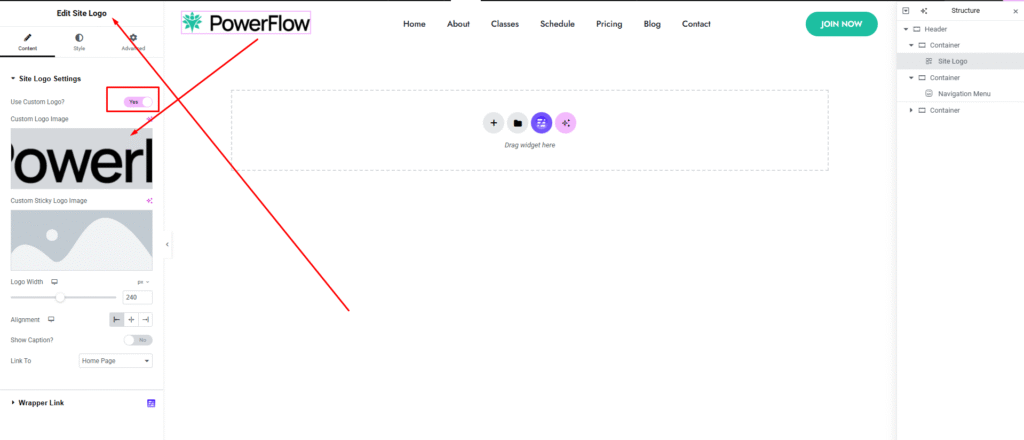 You can add your site logo using our Site Logo widget. Simply enable the “Use Custom Logo” switch, and you’ll see all the essential options, including logo image, sticky logo image, logo width, and placement. You can style everything exactly the way you want—giving you full control over your logo.