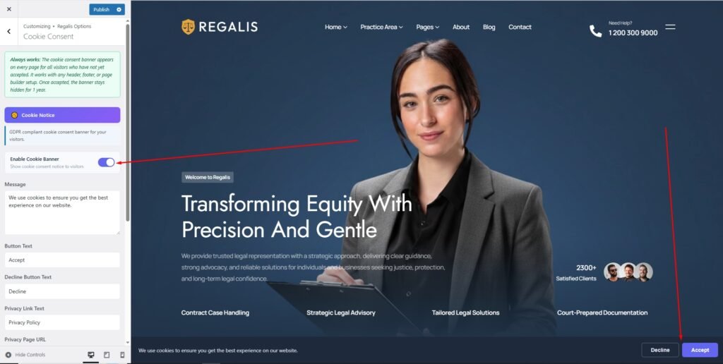 Requirements Getting Start Theme Installation Required Plugin [1] Plugins Documentation and Video Tutorials Importing Demo Content How To Set Default Home Page Theme Customization Options [8] General Settings SiteĀ Settings Color & Typography Settings Header and Footer Settings 404 Page Coming Soon Page Blog & Single Blog Settings Cookie Consent Edit Header Information Edit Footer Information Menus Create & Setup [2] Mega Menu Mega Menu Edit Elementor Widget [2] Widget On/Off Extension On/Off Troubleshooting [2] Demo content installation Failed 404 Error in all pages Update The Theme [3] Envato Market Plugin Manual Update Update by FTP Locate your Envato Item Purchase Code Contact Translations Home / Documentation / Regalis – Lawer, Attonery and Law Firm WordPress Theme / Theme Customization Options Cookie Consent If you want to display a cookie consent notice on your website, you can customize the cookie text and privacy policy link. First, you can enable or disable it from the Customizer. Doc navigation < Coming Soon Page Was this page helpful? Yes No Leave a Reply Cancel replyYour email address will not be published. Required fields are marked *Comment * Name* Email* Website Save my name, email, and website in this browser for the next time I comment.