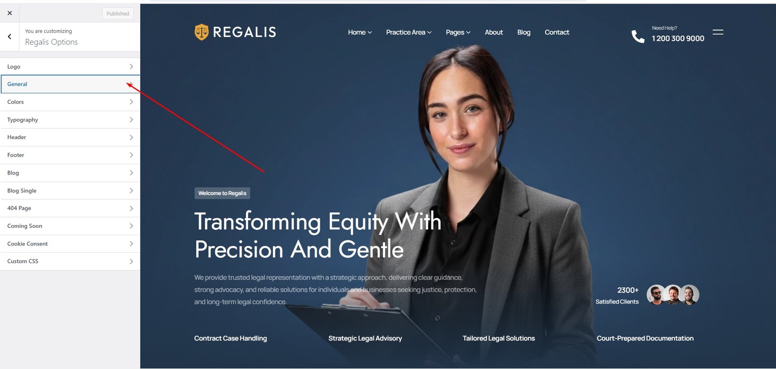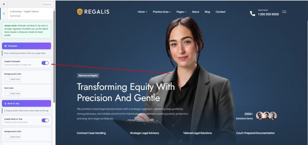 Requirements Getting Start Theme Installation Required Plugin [1] Plugins Documentation and Video Tutorials Importing Demo Content How To Set Default Home Page Theme Customization Options [8] General Settings Site Settings Color & Typography Settings Header and Footer Settings 404 Page Coming Soon Page Blog & Single Blog Settings Cookie Consent Edit Header Information Edit Footer Information Menus Create & Setup [2] Mega Menu Mega Menu Edit Elementor Widget [2] Widget On/Off Extension On/Off Troubleshooting [2] Demo content installation Failed 404 Error in all pages Update The Theme [3] Envato Market Plugin Manual Update Update by FTP Locate your Envato Item Purchase Code Contact Translations Home / Documentation / Regalis – Lawer, Attonery and Law Firm WordPress Theme / Theme Customization Options General Settings Appearance -> Customizer -> Regalis Options -> General Settings Preloader On/Off Preloader Background Color Preloader Dot Color Back To Top On/Off Back To Top Background Color Back To Top Icon Color Publish Changes Doc navigation Site Settings > Was this page helpful? Yes No Leave a Reply Cancel replyYour email address will not be published. Required fields are marked *Comment * Name* Email* Website Save my name, email, and website in this browser for the next time I comment.